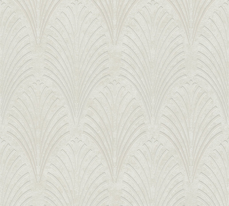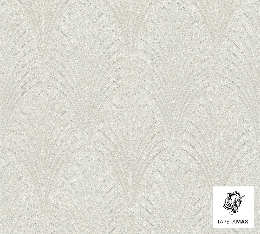 Halvány szürke alapon fényes hatású legyező mintás vlies dekor tapéta.