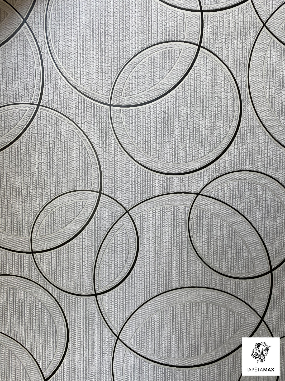 Szürke alapon fekete kör mintás vlies tapéta.