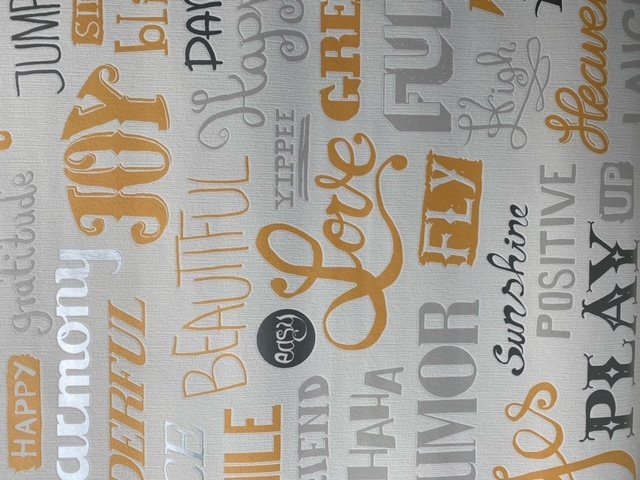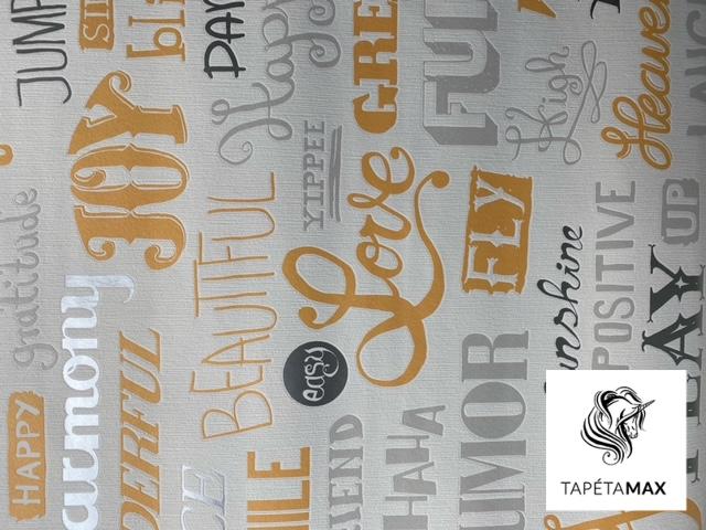 Fehér alapon sárga és szürke színű szöveg mintás vlies dekor tapéta