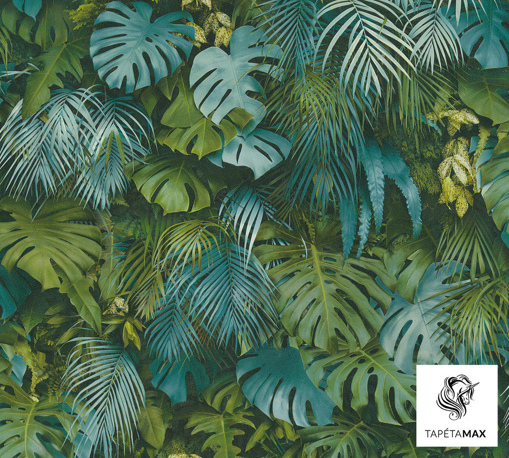 Zöld és kék dzsungel mintás vlies dekor tapéta.