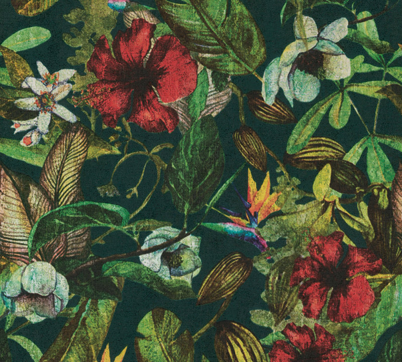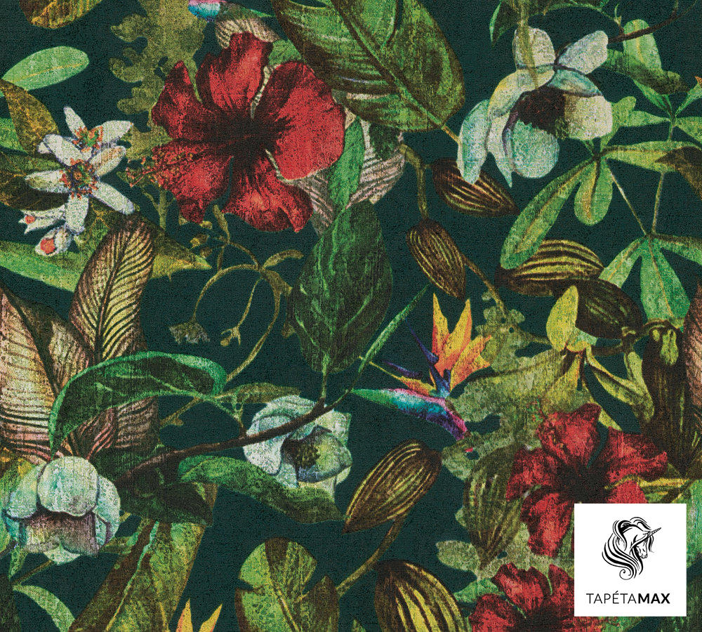 Sötétzöld alapon élénk színű növény mintás vlies tapéta.